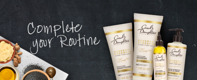 Carol's Daughter Goddess Strength Fortifying Conditioner with Castor Oil helps target weak strands, restoring intense moisture and fortifying hair so each strand is stronger from root to tip. Paraben Free Conditioner for weak hair with Castor Oil and Black Seed Oil makes hair easier to detangle so there’s less breakage and hair can keep it's length, Goddess Strength System - Delivers 15X stronger hair in one use, 94% less breakage*, and supports the strength of your hair as it gets longer. Explore the Regimen - Goddess Strength System with Castor Oil for hair that is weak and prone to breakage. Includes Fortifying Shampoo, Fortifying Conditioner, Anti Breakage Hair Oil and Leave In Conditioner. The Goddess Strength Recipe - Blended with Castor Oil, Black Seed Oil and Ginger.