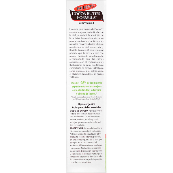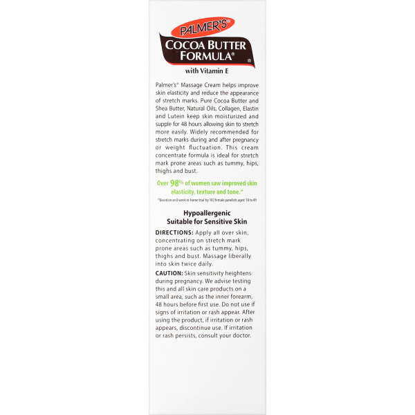 Palmer's Cocoa Butter Formula Massage Cream helps visibly improve skin elasticity and reduce the appearance of stretch marks. Pure Cocoa Butter and Shea Butter, Natural Oils, Collagen, Elastin and Lutein keep skin moisturized and supple for 48 hours allowing skin to stretch more easily. Widely recommended for stretch marks during and after pregnancy or weight fluctuation. This cream concentrate formula is ideal for stretch mark prone areas such as tummy, hips, thighs and bust.